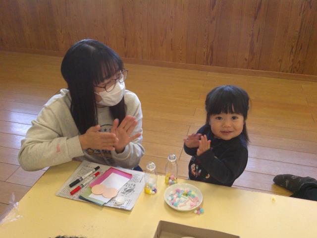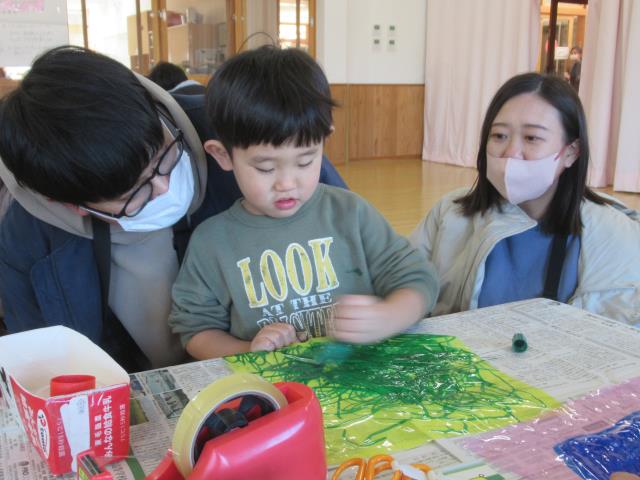各クラス保育参観を実施しました。かもしか組は凧作り、こぐま組はパラシュート作り、りす組は車作り、うさぎ組はぴょんコップ作り、ひよこ組はひなまつり製作。いつもとは違う雰囲気の中でしたが、お父さんお母さんと一緒の活動に、笑顔溢れる姿が見られましたね!また、前期よりも成長した姿を見れたのではないでしょうか?お忙しい中、ご参加ありがとうございました。